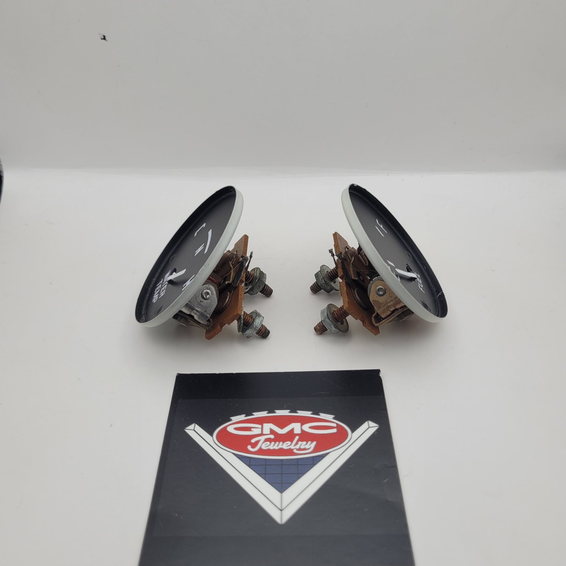 A set of original Fuel and Temp gauges compatible with 1960-66 GMC 1000 light duty instrument clusters. This set has been cleaned, refaced with needles repainted to freshen up the old faded ones.
